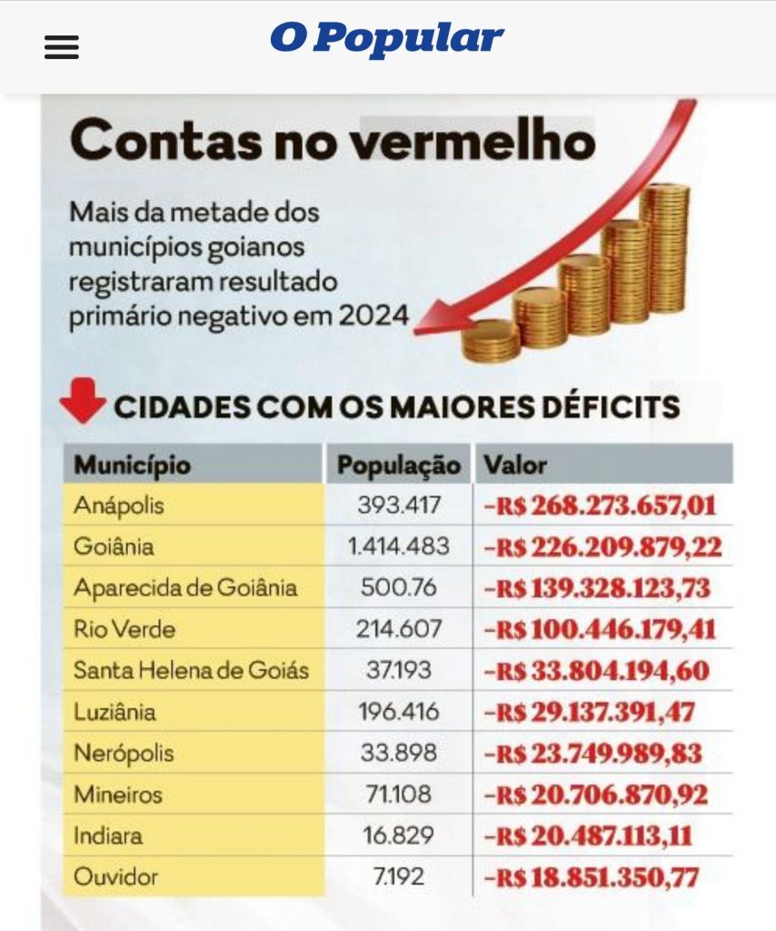 Enquanto isso, mais da metade dos municípios goianos — 128 cidades — terminaram o ano com resultado primário negativo. Entre os maiores déficits estão os municípios mais populosos do estado: Anápolis, com R$ 268 milhões de déficit; Goiânia, com R$ 226 milhões; e Aparecida de Goiânia, com R$ 139 milhões.