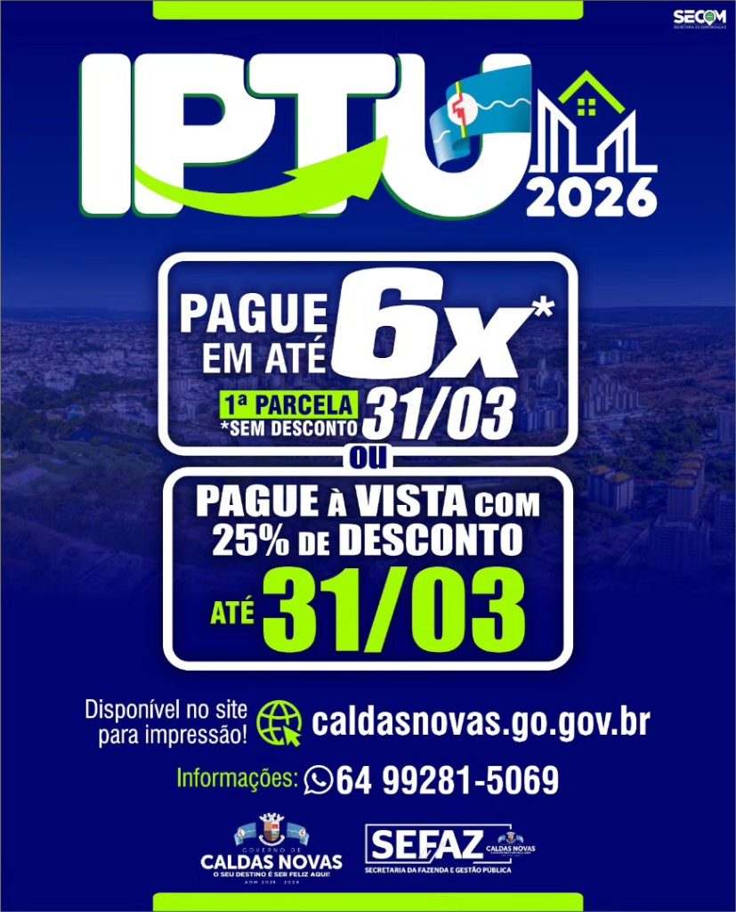 O Governo de Caldas Novas, através da Secretaria de Fazenda e Gestão Pública, disponibilizou site oficial da Prefeitura, o link para impressão do pagamento do IPTU 2026.